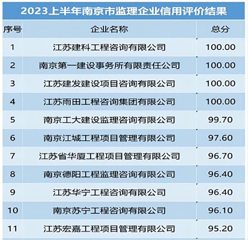 宏嘉公司在2023年上半年南京市建設(shè)工程監(jiān)理企業(yè)信用評(píng)價(jià)評(píng)比中以95.2分取得全市第11名,在參與信用評(píng)比的340家監(jiān)理企業(yè)中名列前茅。